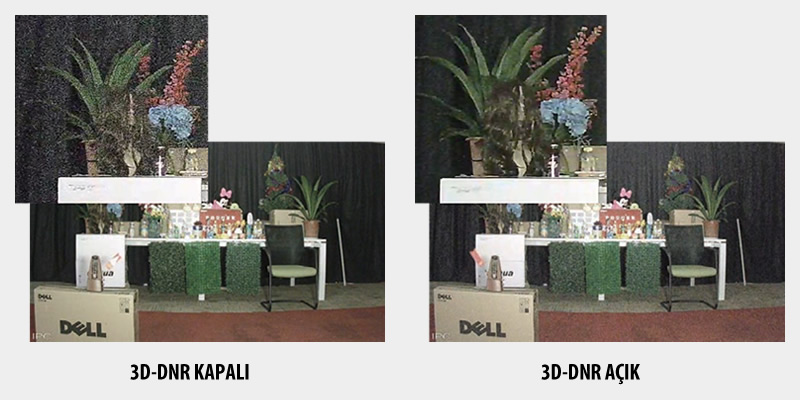 Digital Noise Reduction (DNR); 3D-DNR Nedir? 3 boyutlu olarak, resimdeki gürültüleri azaltma özelliğidir.Yeni nesil 3D-DNR özelliği, üst düzey sinyal/parazit dengesi oluşturarak mükemmel bir görüntü elde eder.Özetle sisteminizin %70’lere varan oranda daha uzun süreli kayıt yapmasını sağlar.Öyleyse Yansıma ve bulanıklık oluşturmadan düşük ışıklı koşullarda görüntüdeki parazitlenmeyi daha çok gidermek ve görüntü kalitesini geliştirmeye yardımcı olması için Ultra 3D-DNR ile görüntüler daha çok geliştirilmiştir. 3D-DNR basit olarak anlamı Sayısal Gürültü Giderme şeklindede yorumlayabilirz. Kamera içerisindeki sayısal işaret işleme devresinde uygulanan filtreleme yöntemi ile çevresel etkenlerden kaynaklı sinyal gürültülerini giderme için kullanılan özelliktir. Öyleyse Daha Net ve detaylı ve parazitsiz görüntü vermeye yarayan teknolojinin adıdır diyebiliriz.
